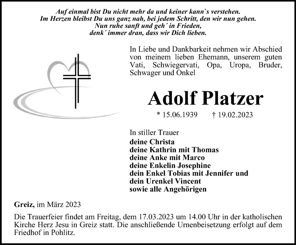 Hier finden Sie alle Traueranzeigen aus der Zeitung, die bisher für Adolf Platzer erschienen sind. Weitere Traueranzeigen, die in der Zeitung erscheinen, werden hier ebenfalls aufgelistet