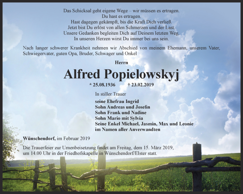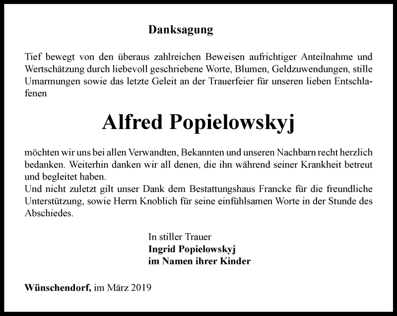 Hier finden Sie alle Traueranzeigen aus der Zeitung, die bisher für Alfred Popielowskyj erschienen sind. Weitere Traueranzeigen, die in der Zeitung erscheinen, werden hier ebenfalls aufgelistet