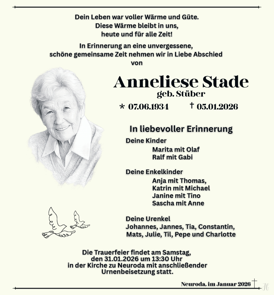 Hier finden Sie alle Traueranzeigen aus der Zeitung, die bisher für Anneliese Stade erschienen sind. Weitere Traueranzeigen, die in der Zeitung erscheinen, werden hier ebenfalls aufgelistet