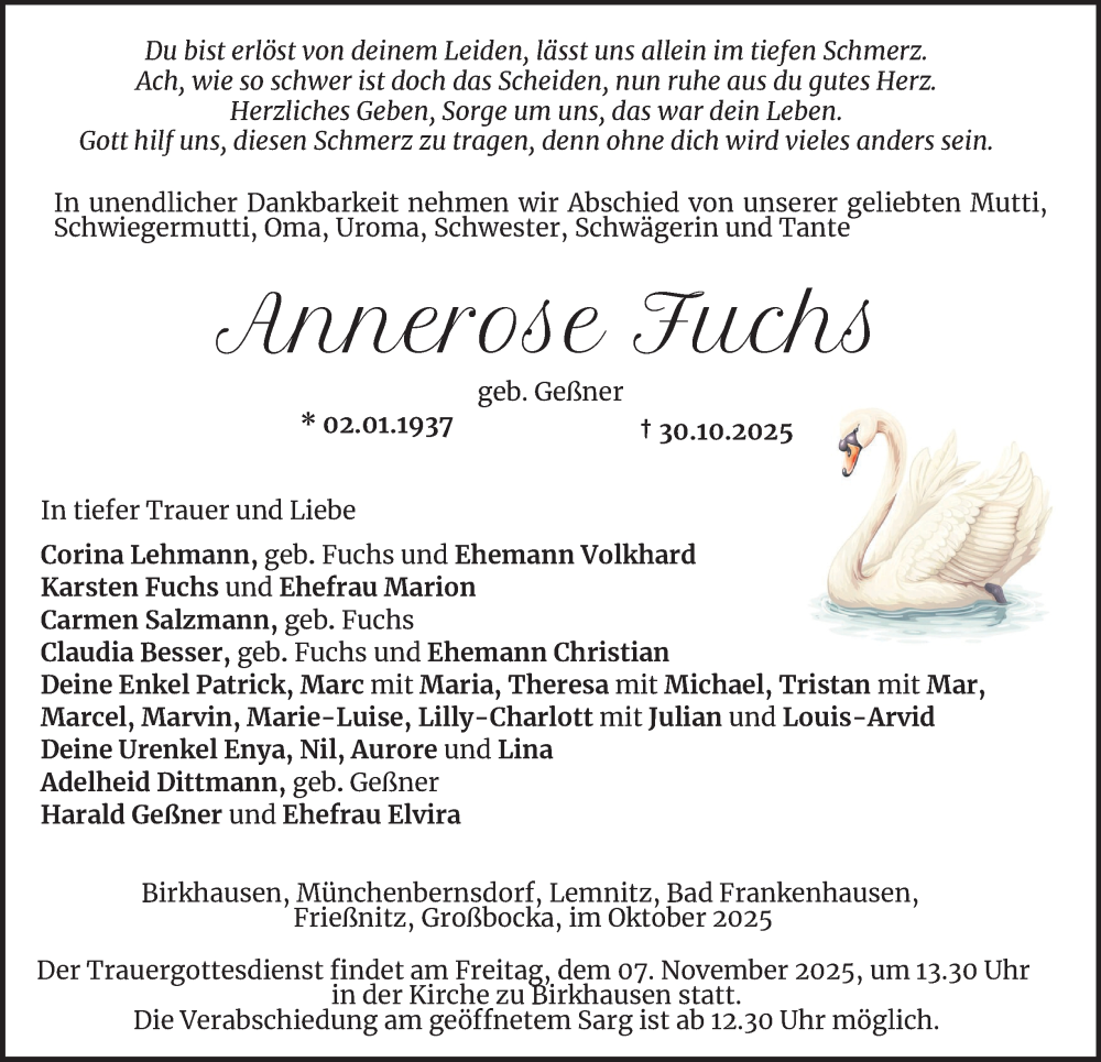 Hier finden Sie alle Traueranzeigen aus der Zeitung, die bisher für Annerose Fuchs erschienen sind. Weitere Traueranzeigen, die in der Zeitung erscheinen, werden hier ebenfalls aufgelistet
