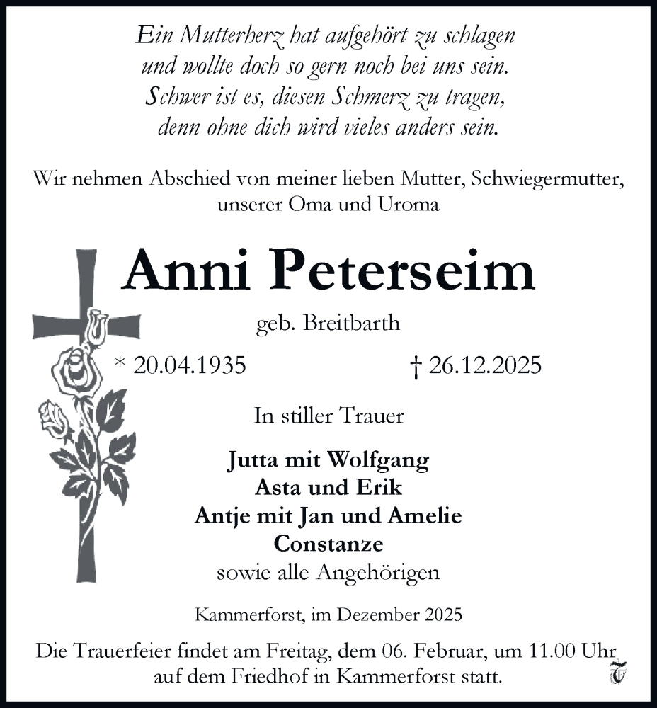 Hier finden Sie alle Traueranzeigen aus der Zeitung, die bisher für Anni Peterseim erschienen sind. Weitere Traueranzeigen, die in der Zeitung erscheinen, werden hier ebenfalls aufgelistet