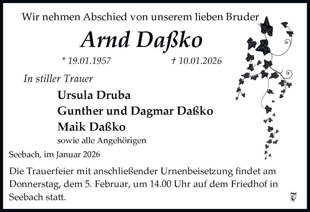 Hier finden Sie alle Traueranzeigen aus der Zeitung, die bisher für Arnd Daßko erschienen sind. Weitere Traueranzeigen, die in der Zeitung erscheinen, werden hier ebenfalls aufgelistet