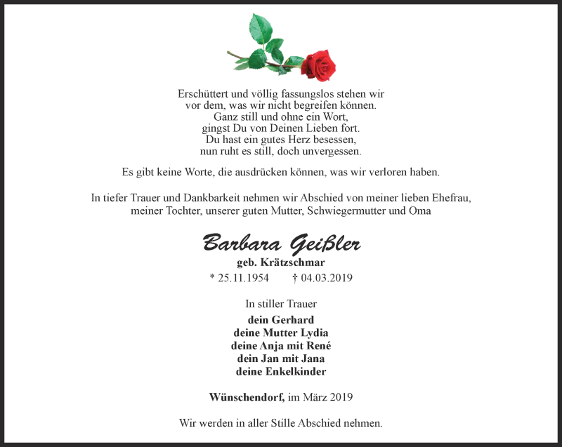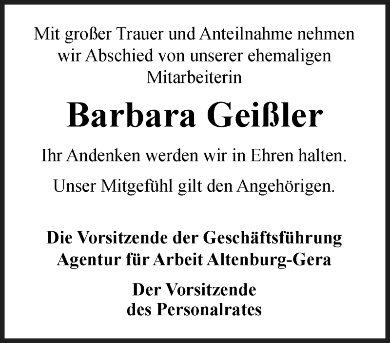 Hier finden Sie alle Traueranzeigen aus der Zeitung, die bisher für Barbara Geißler erschienen sind. Weitere Traueranzeigen, die in der Zeitung erscheinen, werden hier ebenfalls aufgelistet