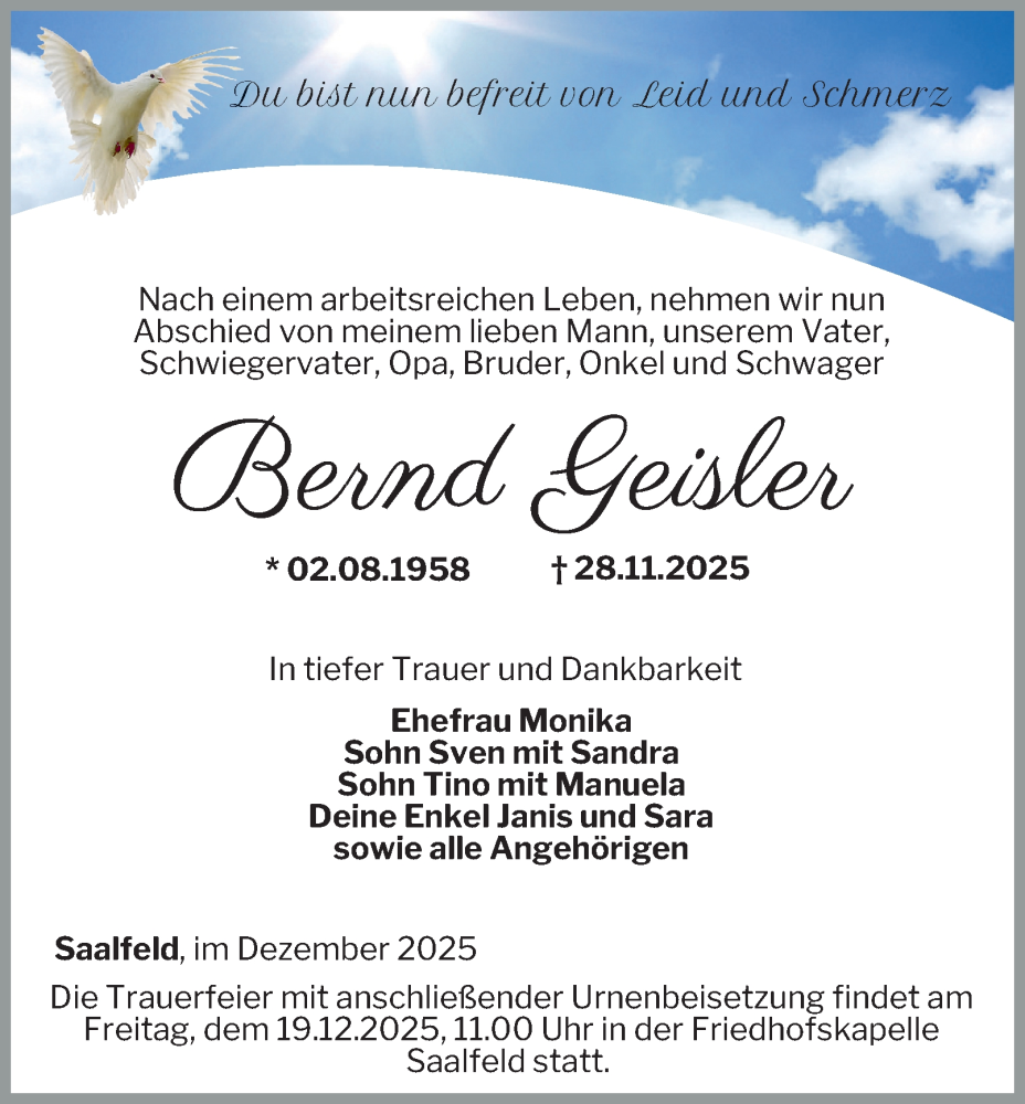 Hier finden Sie alle Traueranzeigen aus der Zeitung, die bisher für Bernd Geisler erschienen sind. Weitere Traueranzeigen, die in der Zeitung erscheinen, werden hier ebenfalls aufgelistet