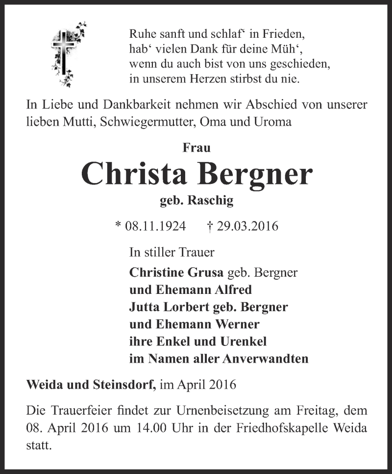 Hier finden Sie alle Traueranzeigen aus der Zeitung, die bisher für Christa Bergner erschienen sind. Weitere Traueranzeigen, die in der Zeitung erscheinen, werden hier ebenfalls aufgelistet