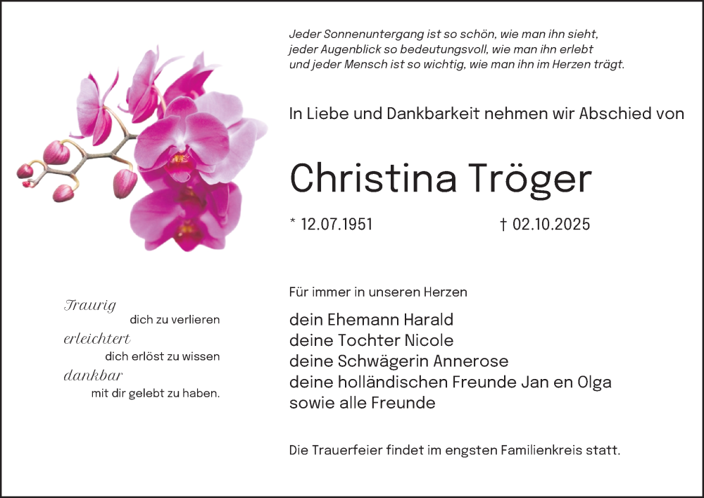 Hier finden Sie alle Traueranzeigen aus der Zeitung, die bisher für Christina Tröger erschienen sind. Weitere Traueranzeigen, die in der Zeitung erscheinen, werden hier ebenfalls aufgelistet