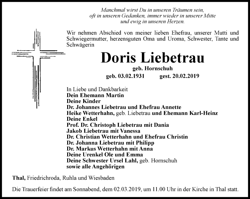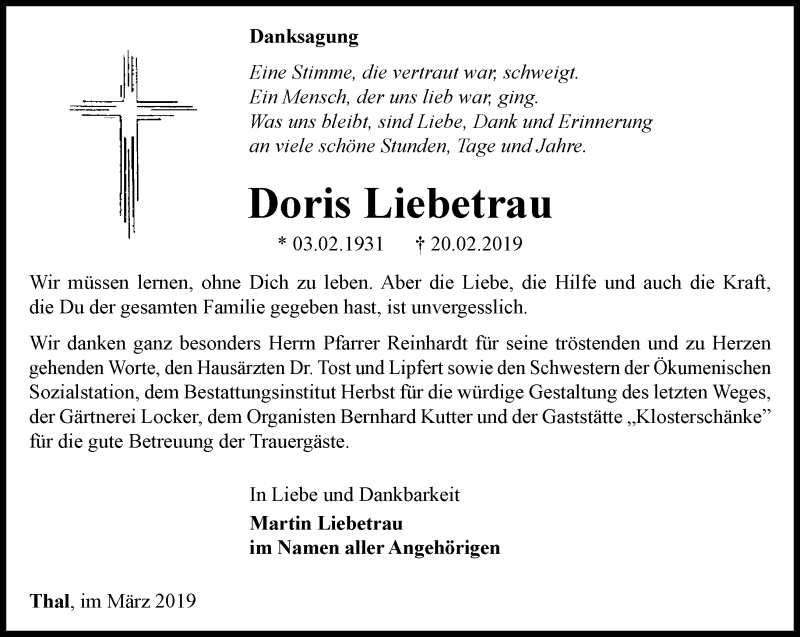Hier finden Sie alle Traueranzeigen aus der Zeitung, die bisher für Doris Liebetrau erschienen sind. Weitere Traueranzeigen, die in der Zeitung erscheinen, werden hier ebenfalls aufgelistet