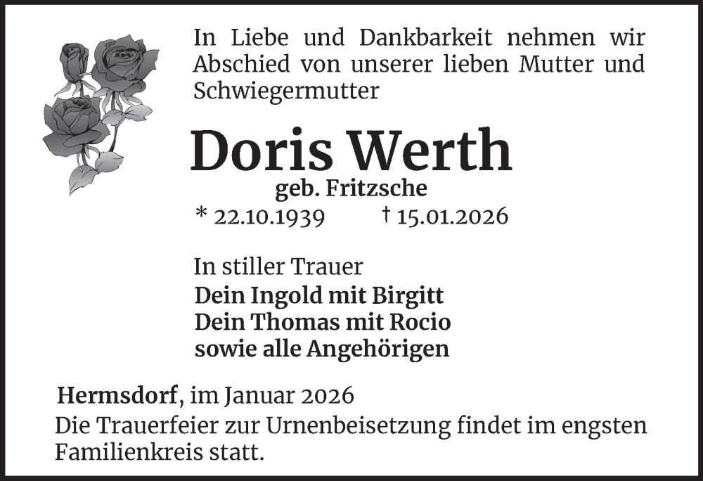 Hier finden Sie alle Traueranzeigen aus der Zeitung, die bisher für Doris Werth erschienen sind. Weitere Traueranzeigen, die in der Zeitung erscheinen, werden hier ebenfalls aufgelistet