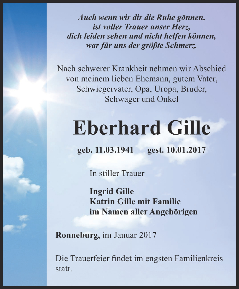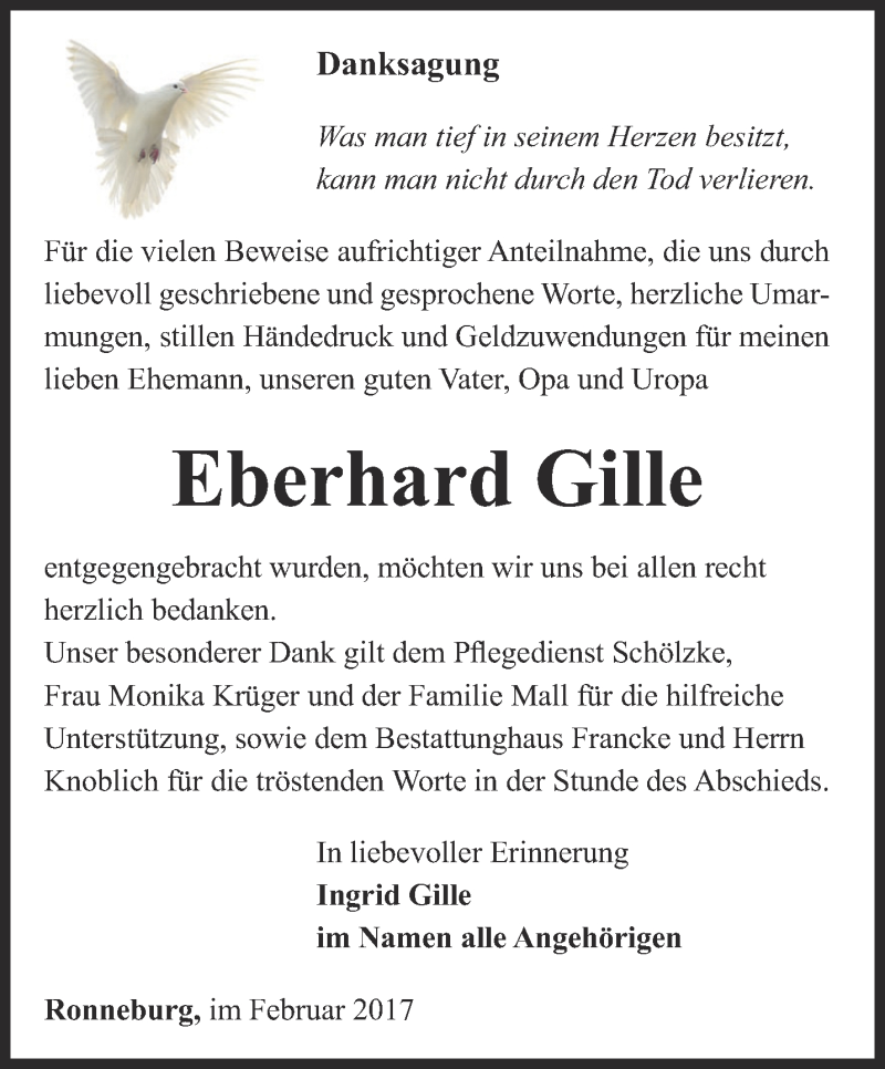 Hier finden Sie alle Traueranzeigen aus der Zeitung, die bisher für Eberhard Gille erschienen sind. Weitere Traueranzeigen, die in der Zeitung erscheinen, werden hier ebenfalls aufgelistet