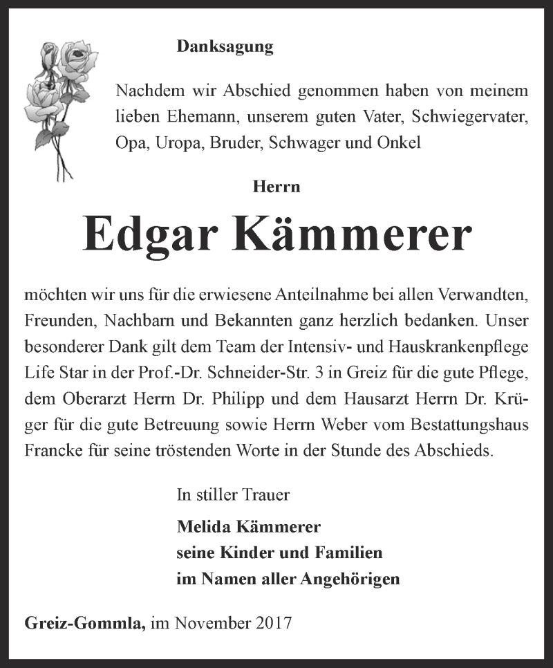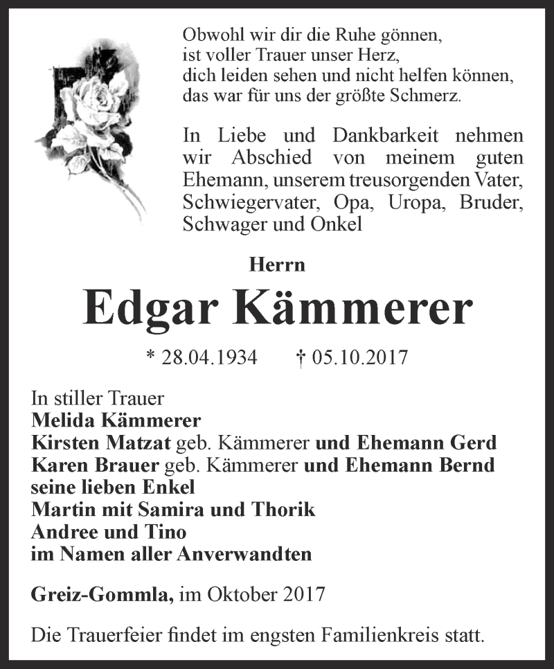 Hier finden Sie alle Traueranzeigen aus der Zeitung, die bisher für Edgar Kämmerer erschienen sind. Weitere Traueranzeigen, die in der Zeitung erscheinen, werden hier ebenfalls aufgelistet