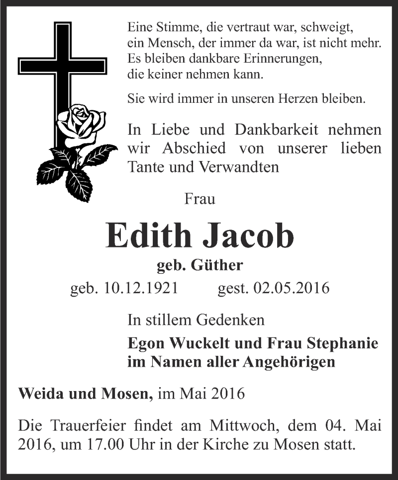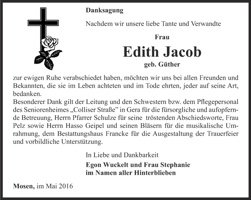 Hier finden Sie alle Traueranzeigen aus der Zeitung, die bisher für Edith Jacob erschienen sind. Weitere Traueranzeigen, die in der Zeitung erscheinen, werden hier ebenfalls aufgelistet
