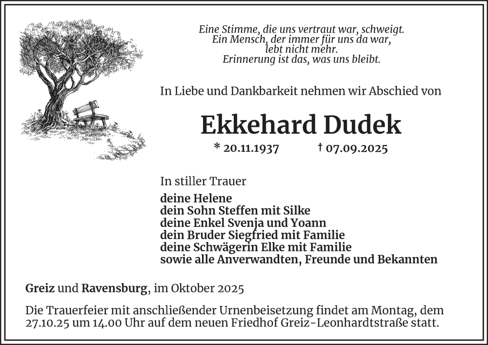 Hier finden Sie alle Traueranzeigen aus der Zeitung, die bisher für Ekkehard Dudek erschienen sind. Weitere Traueranzeigen, die in der Zeitung erscheinen, werden hier ebenfalls aufgelistet