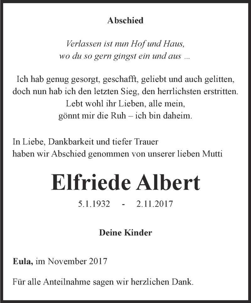 Hier finden Sie alle Traueranzeigen aus der Zeitung, die bisher für Elfriede Albert erschienen sind. Weitere Traueranzeigen, die in der Zeitung erscheinen, werden hier ebenfalls aufgelistet