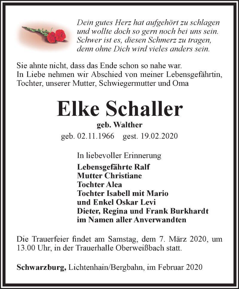 Hier finden Sie alle Traueranzeigen aus der Zeitung, die bisher für Elke Schaller erschienen sind. Weitere Traueranzeigen, die in der Zeitung erscheinen, werden hier ebenfalls aufgelistet