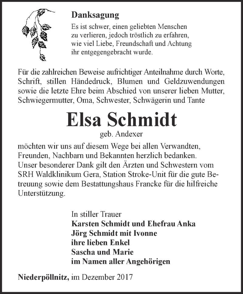 Hier finden Sie alle Traueranzeigen aus der Zeitung, die bisher für Elsa Schmidt erschienen sind. Weitere Traueranzeigen, die in der Zeitung erscheinen, werden hier ebenfalls aufgelistet