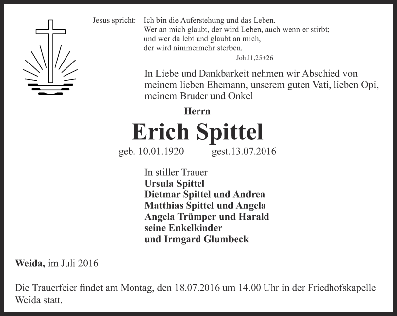 Hier finden Sie alle Traueranzeigen aus der Zeitung, die bisher für Erich Spittel erschienen sind. Weitere Traueranzeigen, die in der Zeitung erscheinen, werden hier ebenfalls aufgelistet