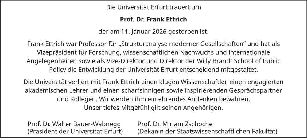 Hier finden Sie alle Traueranzeigen aus der Zeitung, die bisher für Frank Ettrich erschienen sind. Weitere Traueranzeigen, die in der Zeitung erscheinen, werden hier ebenfalls aufgelistet