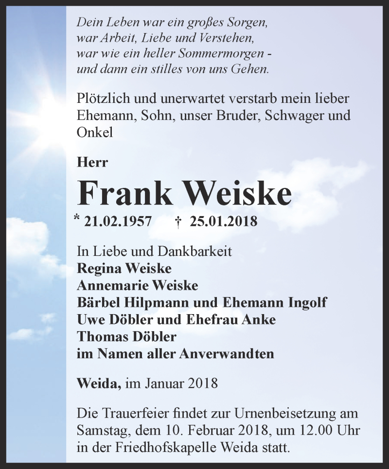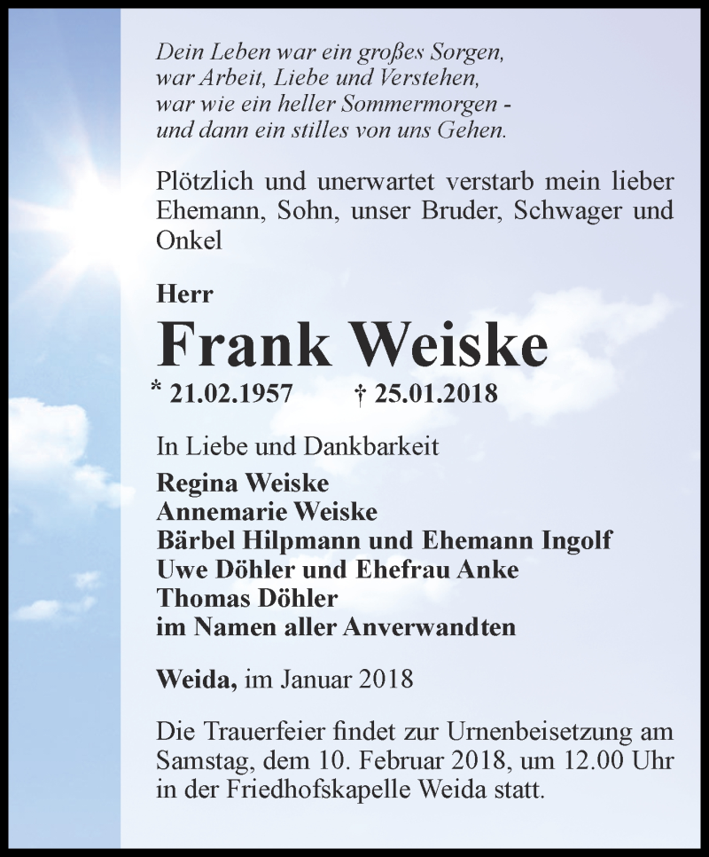 Hier finden Sie alle Traueranzeigen aus der Zeitung, die bisher für Frank Weiske erschienen sind. Weitere Traueranzeigen, die in der Zeitung erscheinen, werden hier ebenfalls aufgelistet