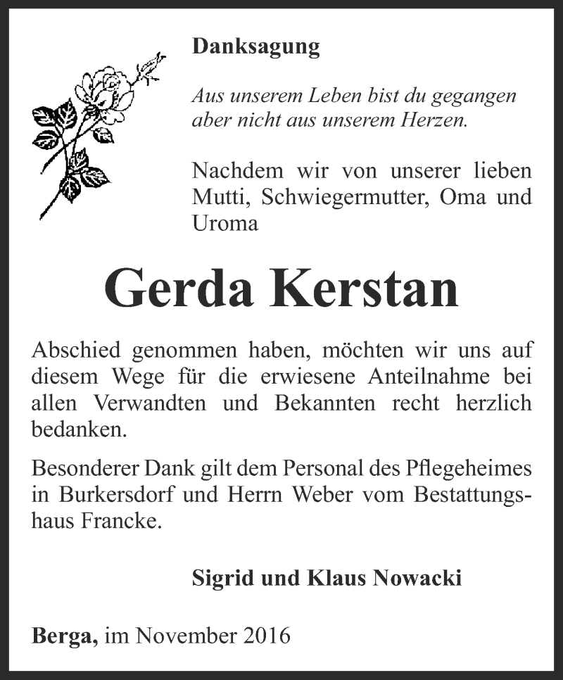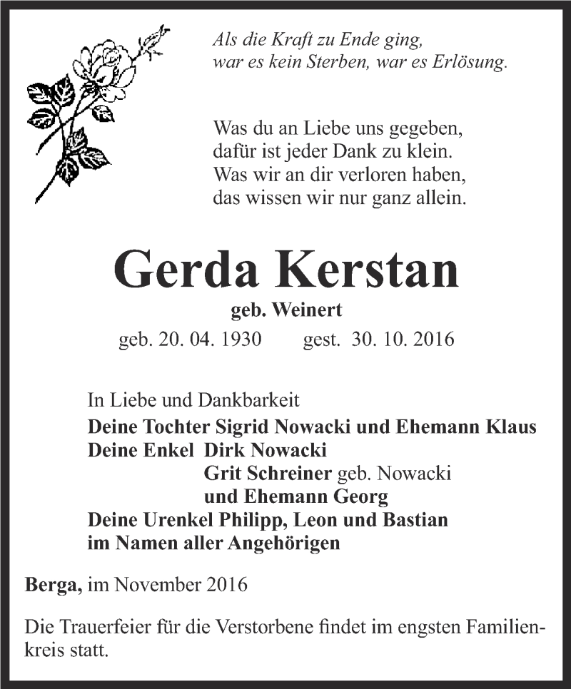 Hier finden Sie alle Traueranzeigen aus der Zeitung, die bisher für Gerda Kerstan erschienen sind. Weitere Traueranzeigen, die in der Zeitung erscheinen, werden hier ebenfalls aufgelistet