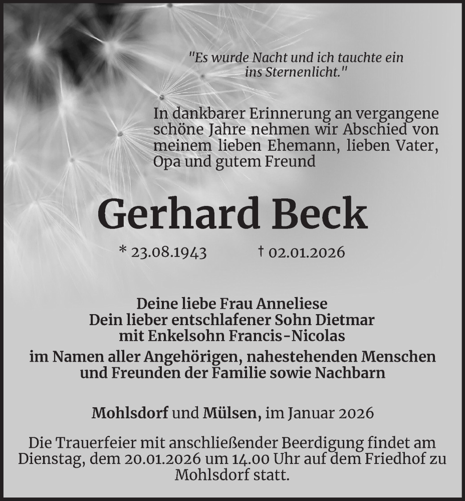 Hier finden Sie alle Traueranzeigen aus der Zeitung, die bisher für Gerhard Beck erschienen sind. Weitere Traueranzeigen, die in der Zeitung erscheinen, werden hier ebenfalls aufgelistet