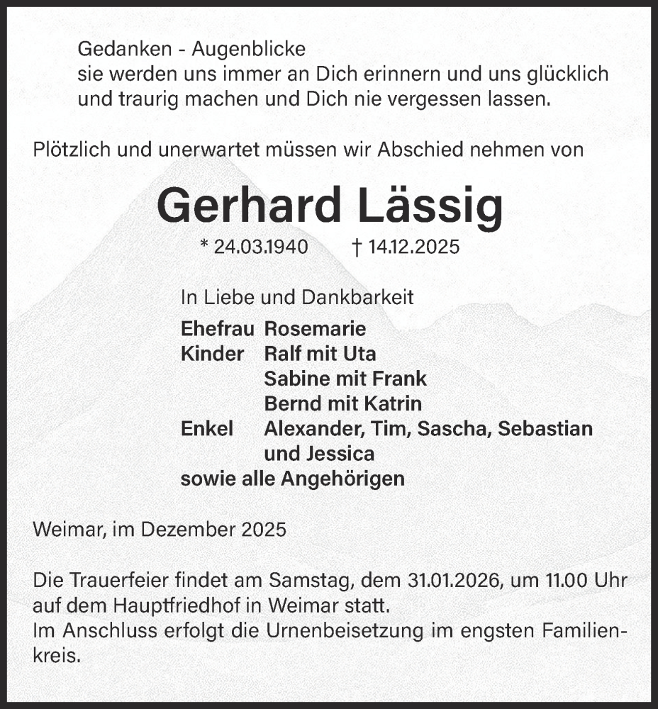 Hier finden Sie alle Traueranzeigen aus der Zeitung, die bisher für Gerhard Lässig erschienen sind. Weitere Traueranzeigen, die in der Zeitung erscheinen, werden hier ebenfalls aufgelistet
