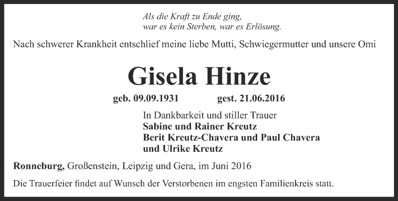 Hier finden Sie alle Traueranzeigen aus der Zeitung, die bisher für Gisela Hintze erschienen sind. Weitere Traueranzeigen, die in der Zeitung erscheinen, werden hier ebenfalls aufgelistet