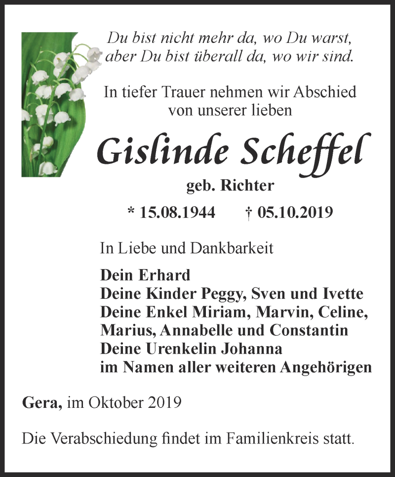 Hier finden Sie alle Traueranzeigen aus der Zeitung, die bisher für Gislinde Scheffel erschienen sind. Weitere Traueranzeigen, die in der Zeitung erscheinen, werden hier ebenfalls aufgelistet