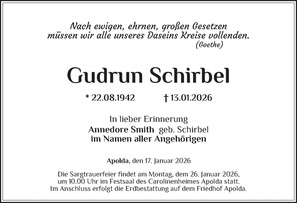 Hier finden Sie alle Traueranzeigen aus der Zeitung, die bisher für Gudrun Schirbel erschienen sind. Weitere Traueranzeigen, die in der Zeitung erscheinen, werden hier ebenfalls aufgelistet