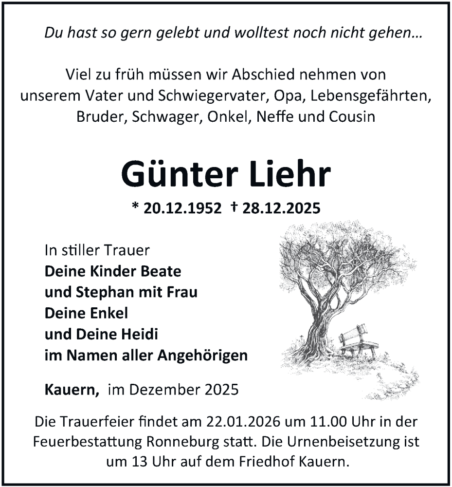 Hier finden Sie alle Traueranzeigen aus der Zeitung, die bisher für Günter Liehr erschienen sind. Weitere Traueranzeigen, die in der Zeitung erscheinen, werden hier ebenfalls aufgelistet