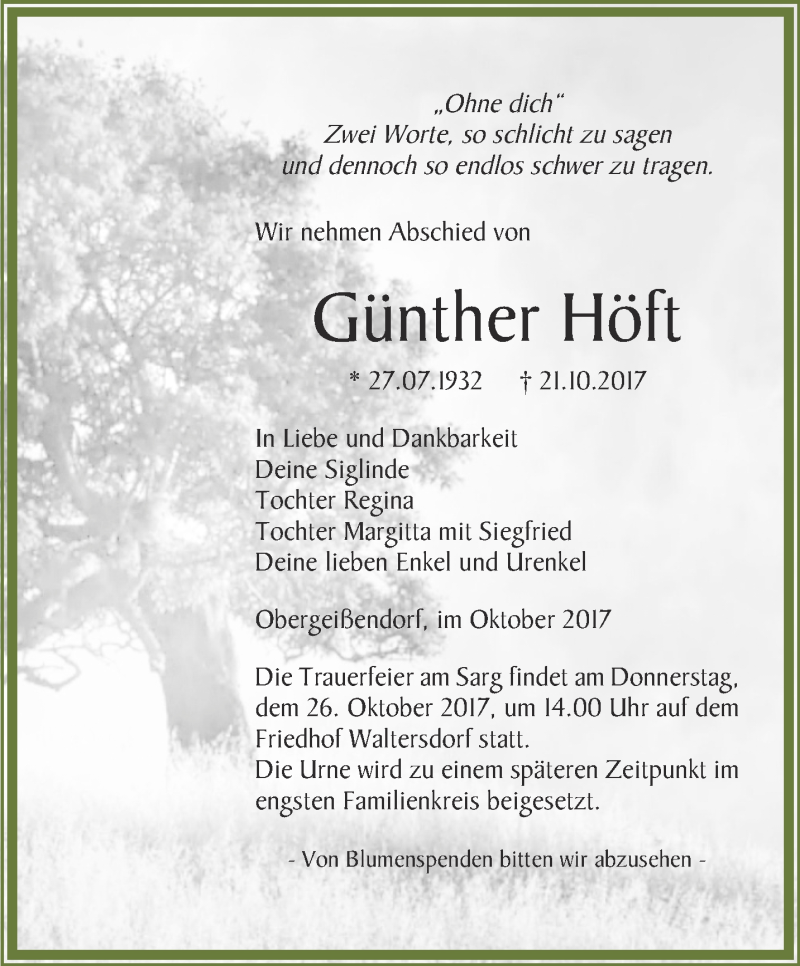 Hier finden Sie alle Traueranzeigen aus der Zeitung, die bisher für Günther Höft erschienen sind. Weitere Traueranzeigen, die in der Zeitung erscheinen, werden hier ebenfalls aufgelistet