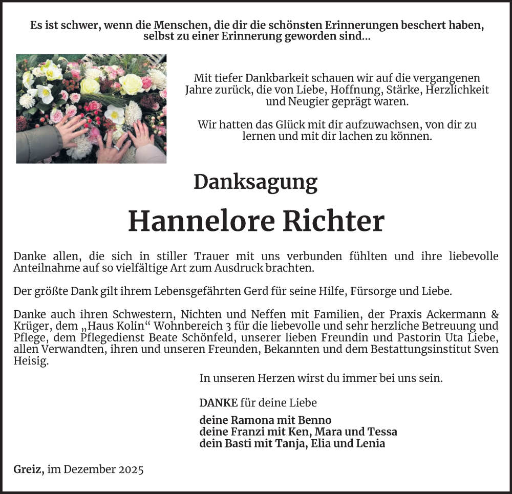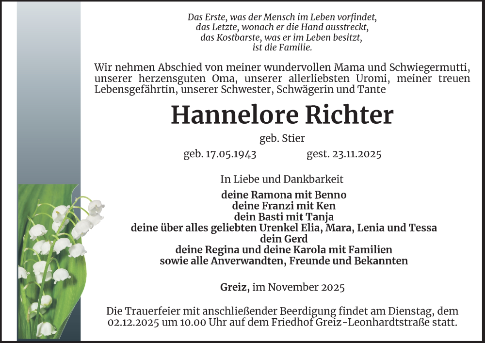 Hier finden Sie alle Traueranzeigen aus der Zeitung, die bisher für Hannelore Richter erschienen sind. Weitere Traueranzeigen, die in der Zeitung erscheinen, werden hier ebenfalls aufgelistet