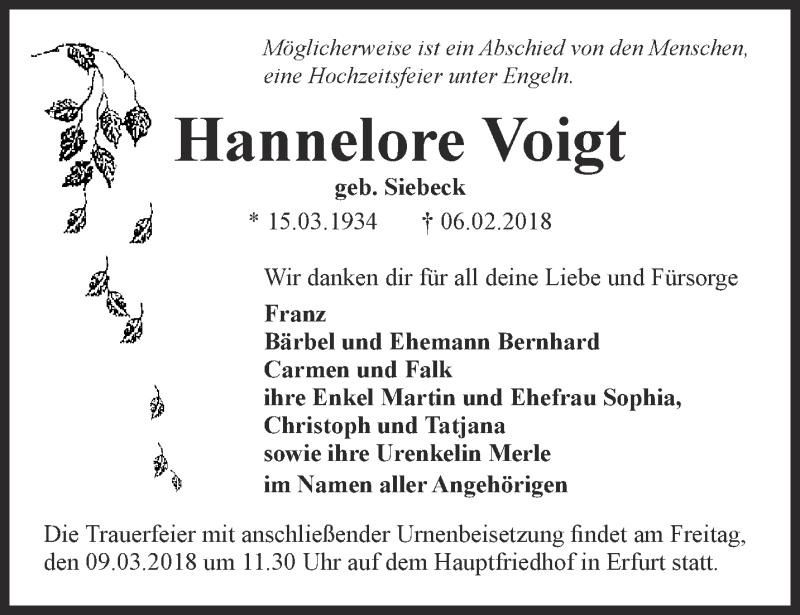Hier finden Sie alle Traueranzeigen aus der Zeitung, die bisher für Hannelore Voigt erschienen sind. Weitere Traueranzeigen, die in der Zeitung erscheinen, werden hier ebenfalls aufgelistet