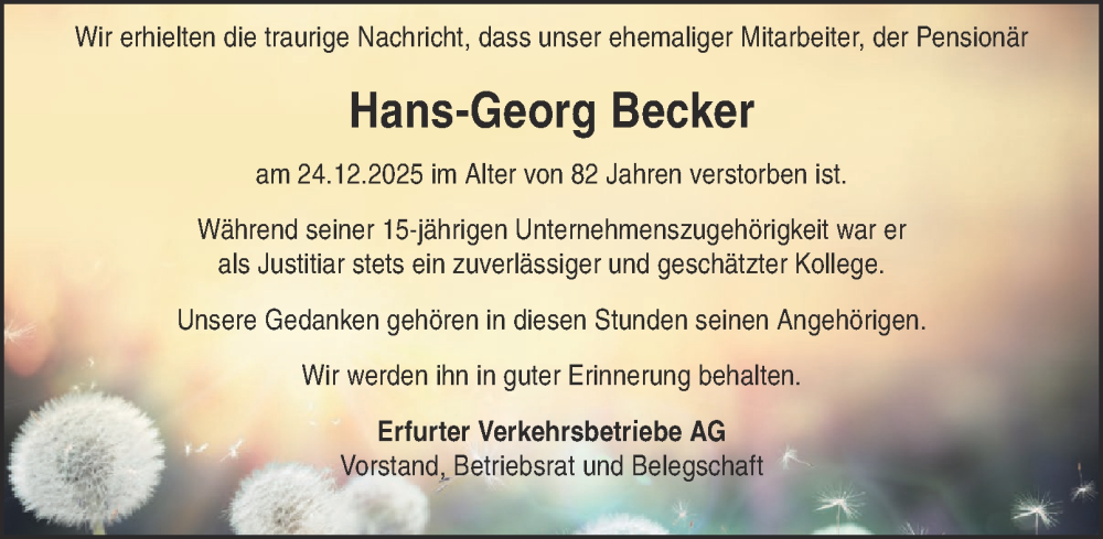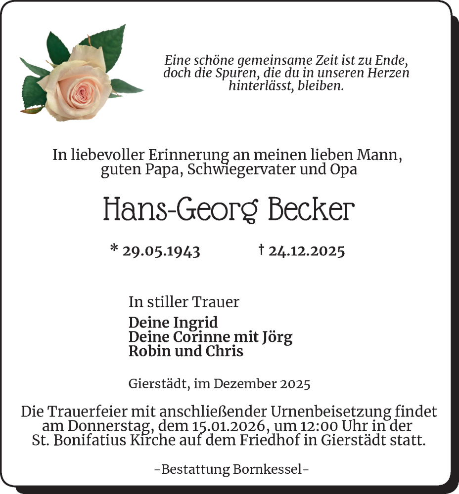 Hier finden Sie alle Traueranzeigen aus der Zeitung, die bisher für Hans-Georg Becker erschienen sind. Weitere Traueranzeigen, die in der Zeitung erscheinen, werden hier ebenfalls aufgelistet
