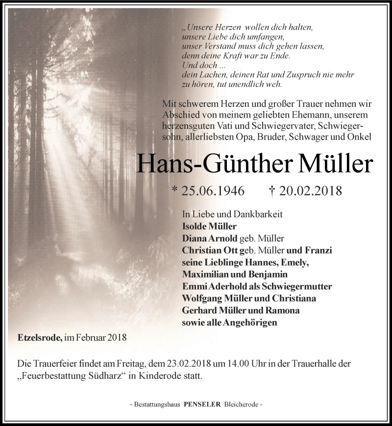 Hier finden Sie alle Traueranzeigen aus der Zeitung, die bisher für Hans-Günther Müller erschienen sind. Weitere Traueranzeigen, die in der Zeitung erscheinen, werden hier ebenfalls aufgelistet