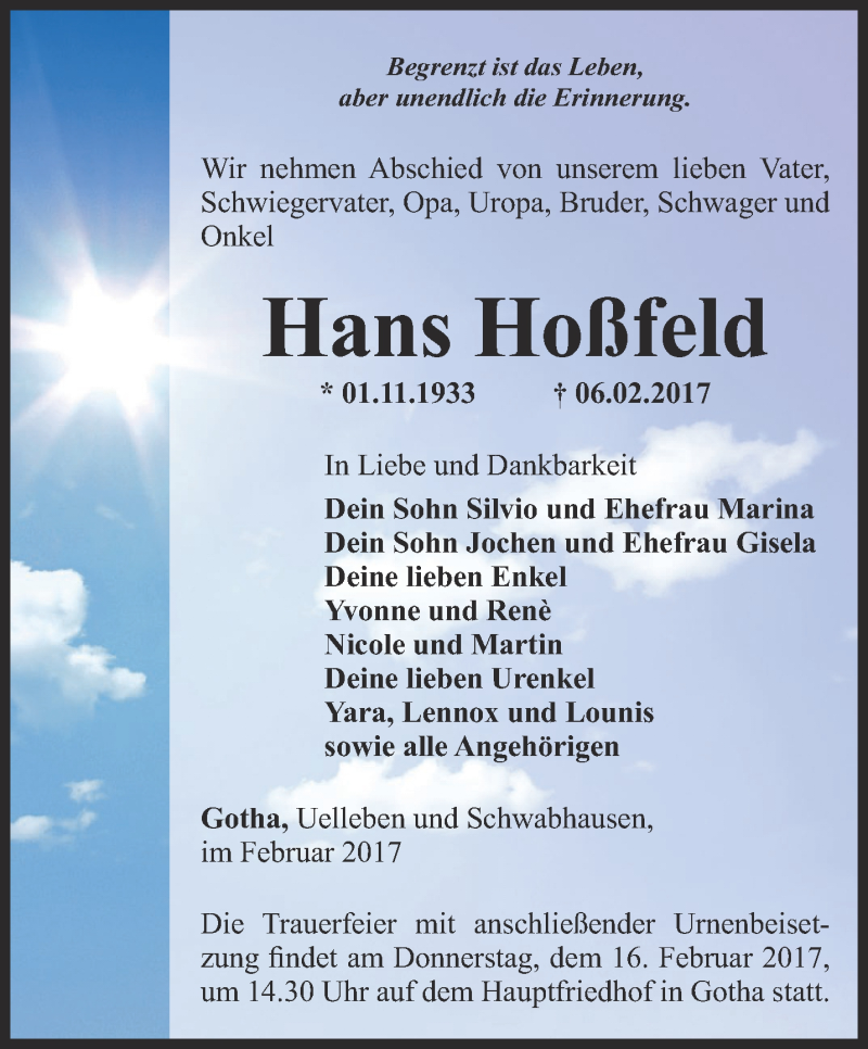 Hier finden Sie alle Traueranzeigen aus der Zeitung, die bisher für Hans Hoßfeld erschienen sind. Weitere Traueranzeigen, die in der Zeitung erscheinen, werden hier ebenfalls aufgelistet