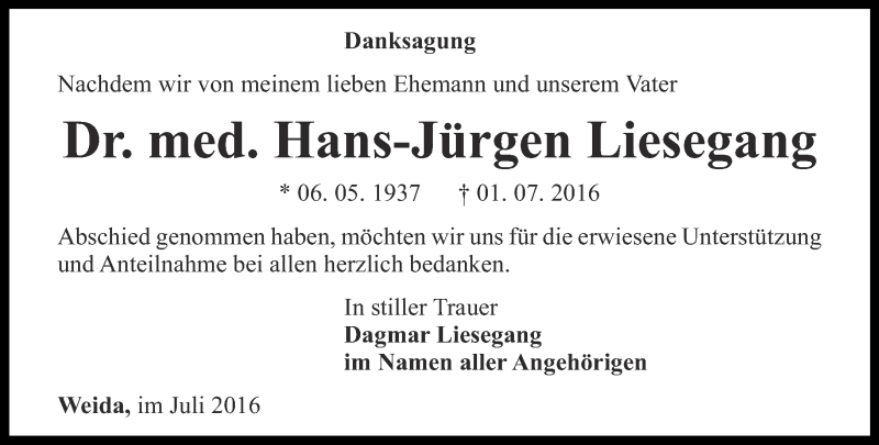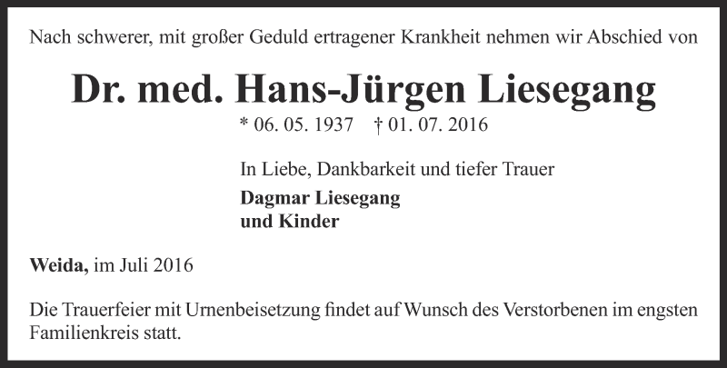 Hier finden Sie alle Traueranzeigen aus der Zeitung, die bisher für Hans-Jürgen Liesegang erschienen sind. Weitere Traueranzeigen, die in der Zeitung erscheinen, werden hier ebenfalls aufgelistet