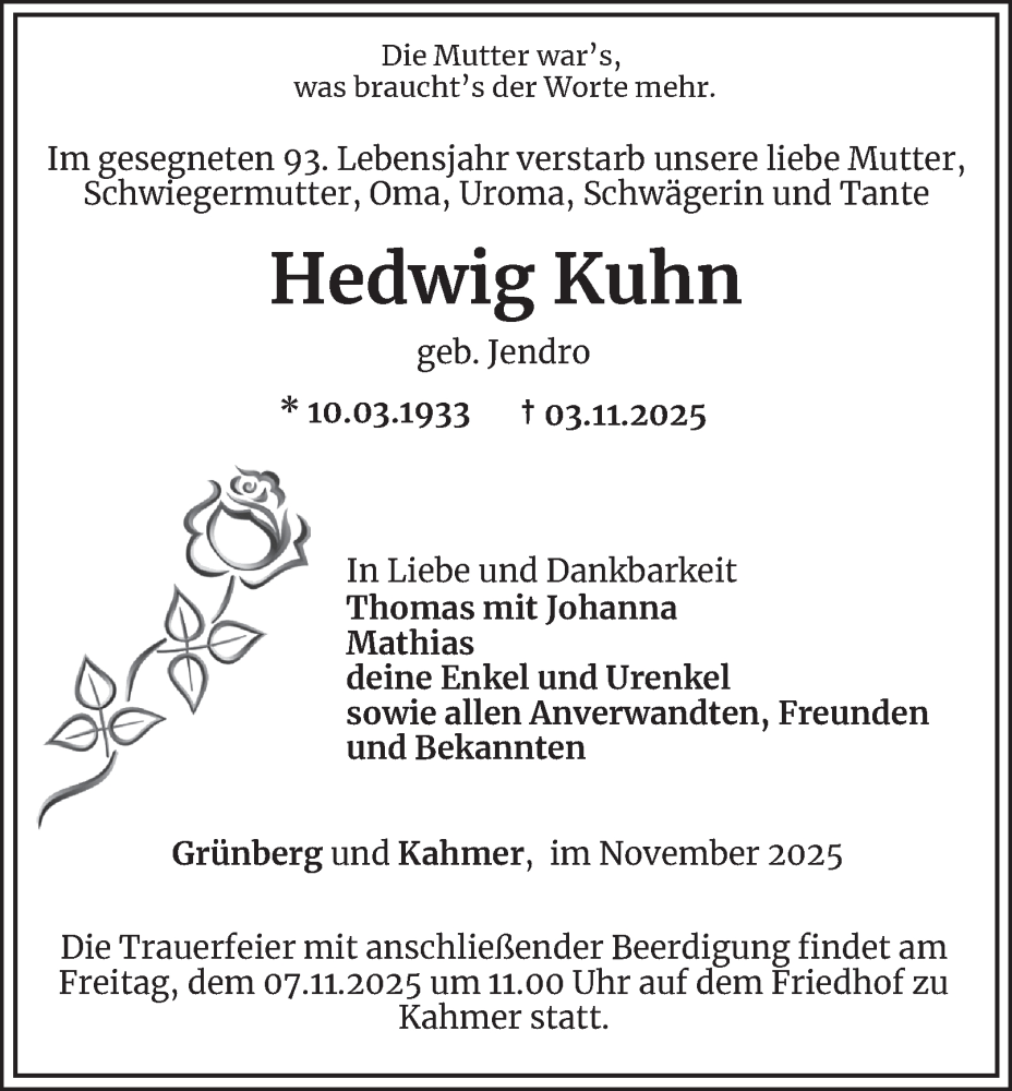Hier finden Sie alle Traueranzeigen aus der Zeitung, die bisher für Hedwig Kuhn erschienen sind. Weitere Traueranzeigen, die in der Zeitung erscheinen, werden hier ebenfalls aufgelistet