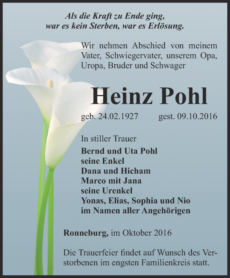 Hier finden Sie alle Traueranzeigen aus der Zeitung, die bisher für Heinz Pohl erschienen sind. Weitere Traueranzeigen, die in der Zeitung erscheinen, werden hier ebenfalls aufgelistet