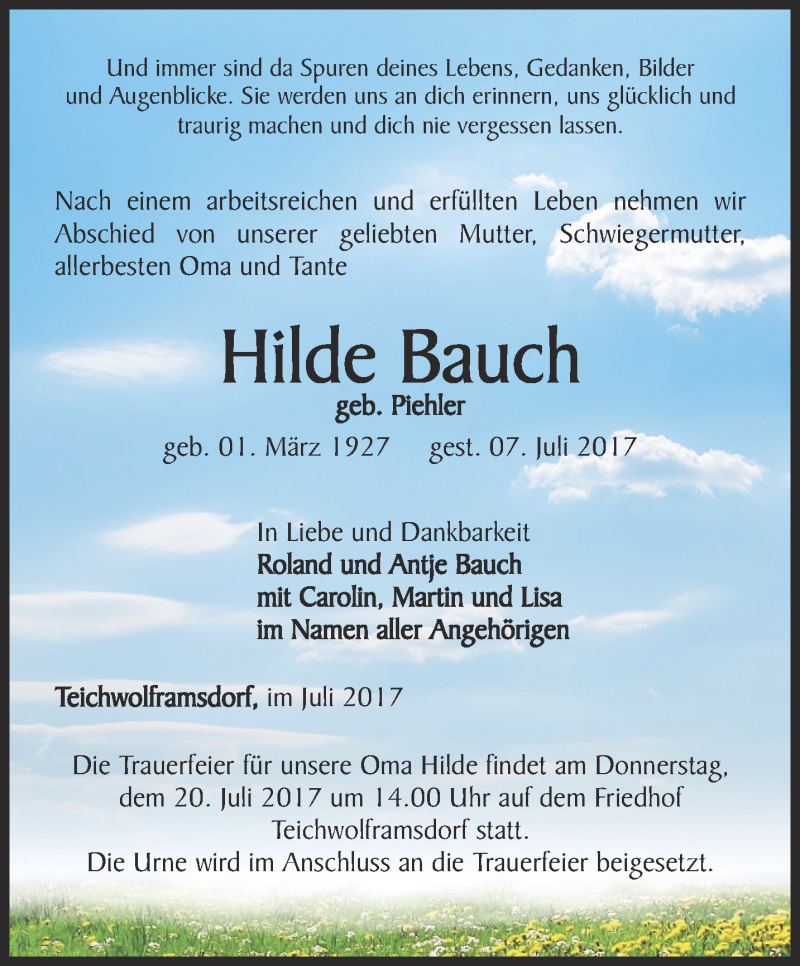 Hier finden Sie alle Traueranzeigen aus der Zeitung, die bisher für Hilde Bauch erschienen sind. Weitere Traueranzeigen, die in der Zeitung erscheinen, werden hier ebenfalls aufgelistet