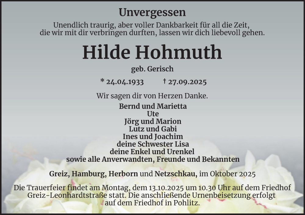 Hier finden Sie alle Traueranzeigen aus der Zeitung, die bisher für Hilde Hohmuth erschienen sind. Weitere Traueranzeigen, die in der Zeitung erscheinen, werden hier ebenfalls aufgelistet