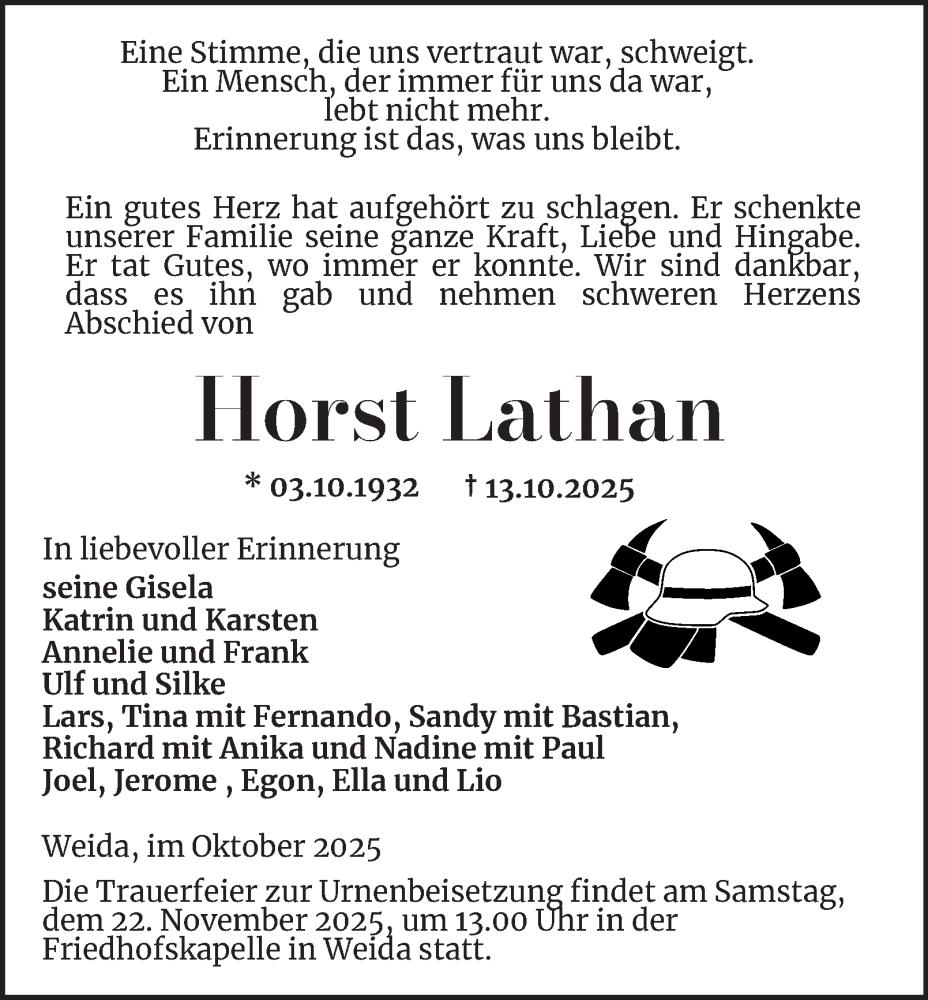 Hier finden Sie alle Traueranzeigen aus der Zeitung, die bisher für Horst Lathan erschienen sind. Weitere Traueranzeigen, die in der Zeitung erscheinen, werden hier ebenfalls aufgelistet