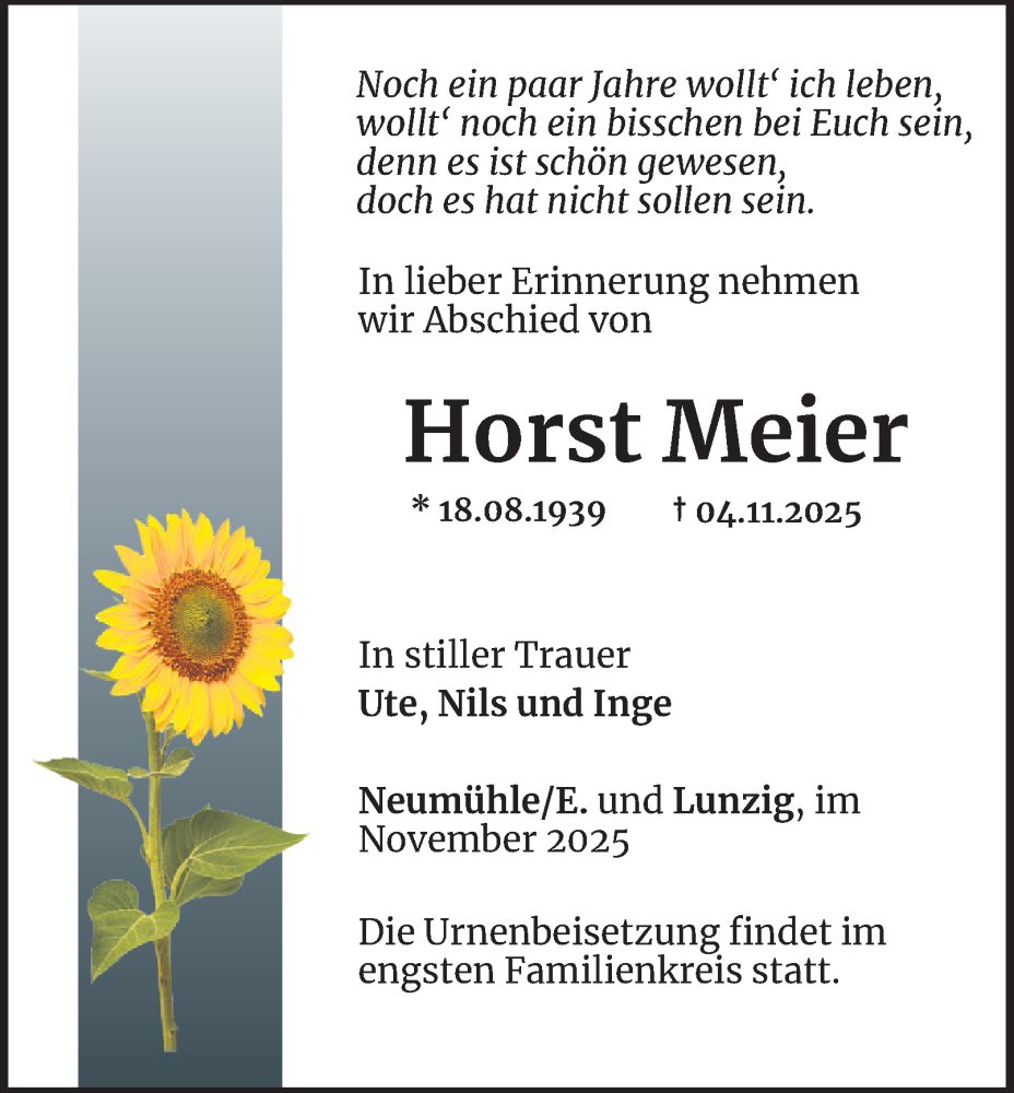 Hier finden Sie alle Traueranzeigen aus der Zeitung, die bisher für Horst Meier erschienen sind. Weitere Traueranzeigen, die in der Zeitung erscheinen, werden hier ebenfalls aufgelistet
