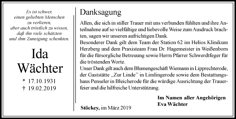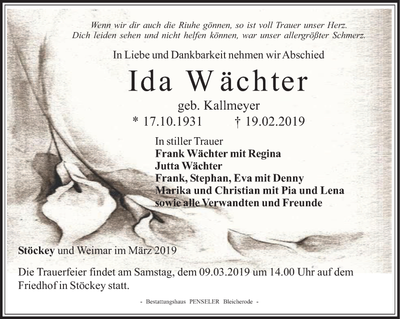 Hier finden Sie alle Traueranzeigen aus der Zeitung, die bisher für Ida Wächter erschienen sind. Weitere Traueranzeigen, die in der Zeitung erscheinen, werden hier ebenfalls aufgelistet