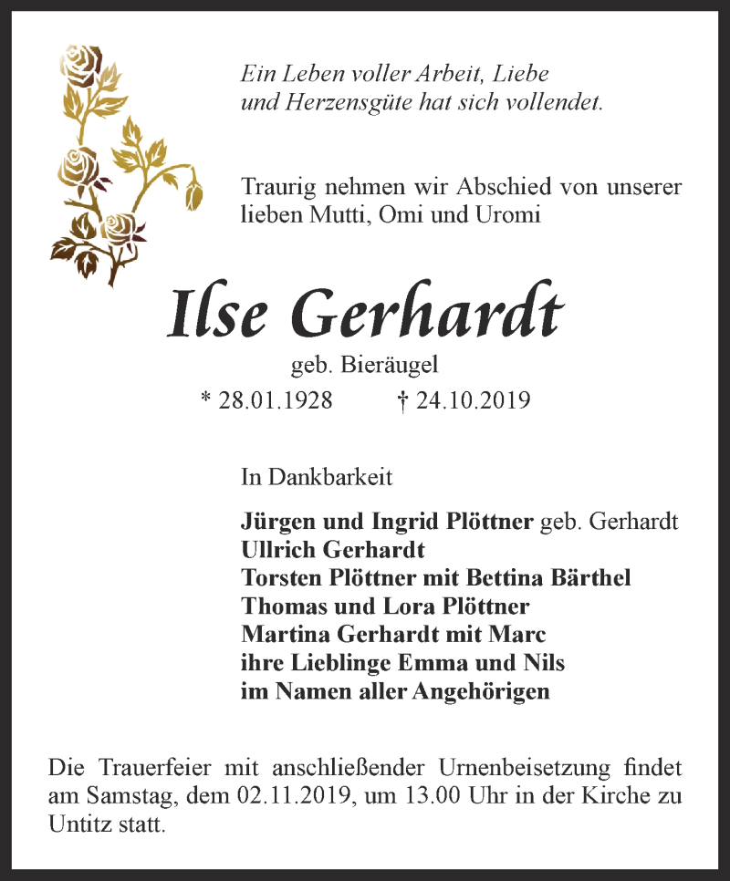 Hier finden Sie alle Traueranzeigen aus der Zeitung, die bisher für Ilse Gerhardt erschienen sind. Weitere Traueranzeigen, die in der Zeitung erscheinen, werden hier ebenfalls aufgelistet