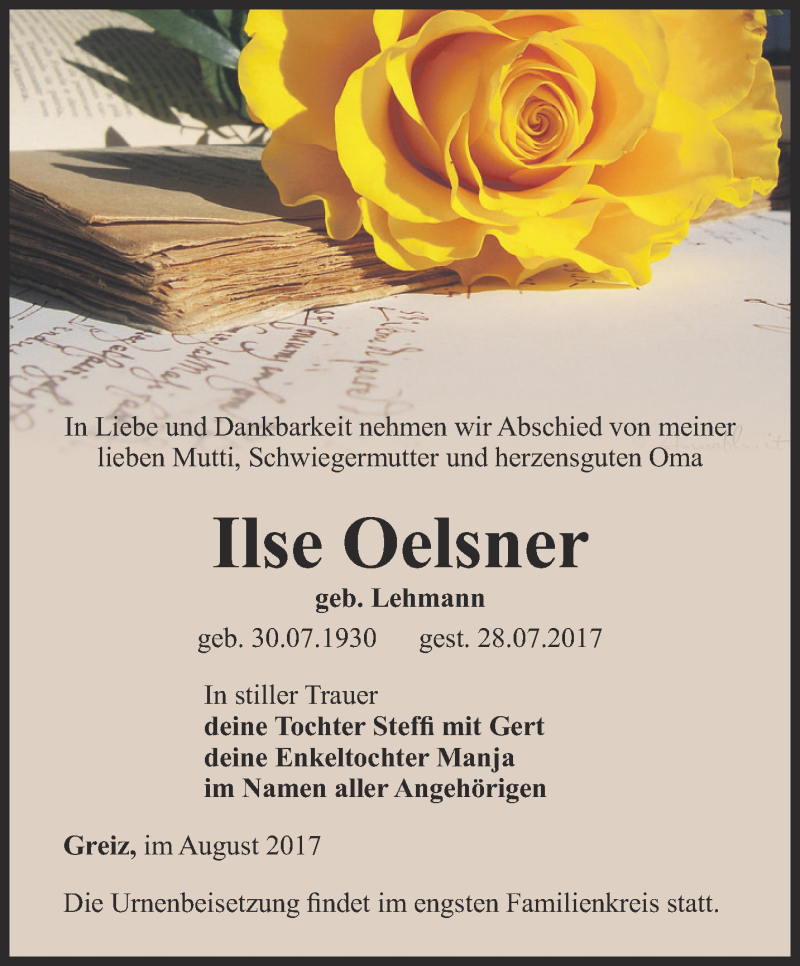 Hier finden Sie alle Traueranzeigen aus der Zeitung, die bisher für Ilse Oelsner erschienen sind. Weitere Traueranzeigen, die in der Zeitung erscheinen, werden hier ebenfalls aufgelistet