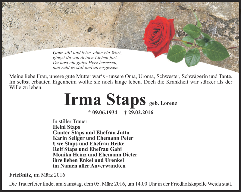 Hier finden Sie alle Traueranzeigen aus der Zeitung, die bisher für Irma Staps erschienen sind. Weitere Traueranzeigen, die in der Zeitung erscheinen, werden hier ebenfalls aufgelistet