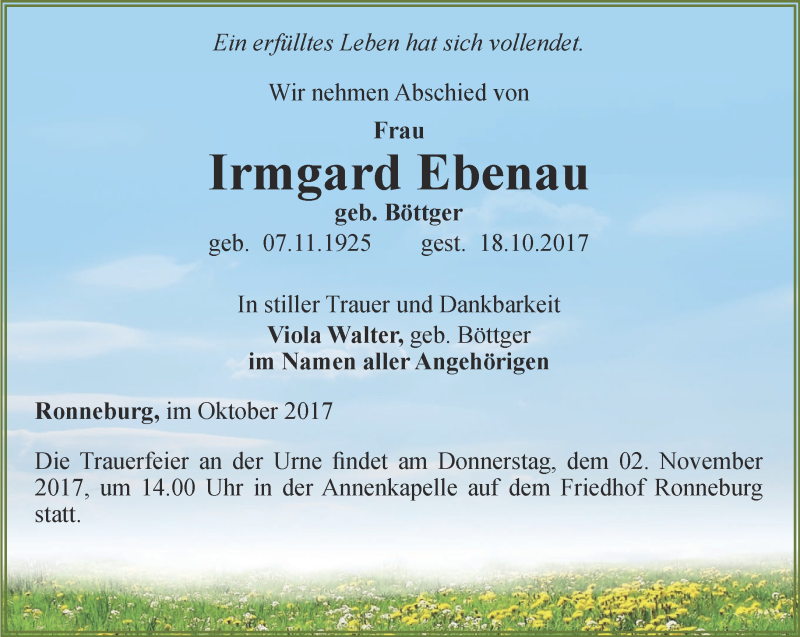 Hier finden Sie alle Traueranzeigen aus der Zeitung, die bisher für Irmgard Ebenau erschienen sind. Weitere Traueranzeigen, die in der Zeitung erscheinen, werden hier ebenfalls aufgelistet
