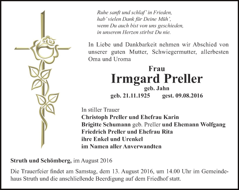 Hier finden Sie alle Traueranzeigen aus der Zeitung, die bisher für Irmgard Preller erschienen sind. Weitere Traueranzeigen, die in der Zeitung erscheinen, werden hier ebenfalls aufgelistet