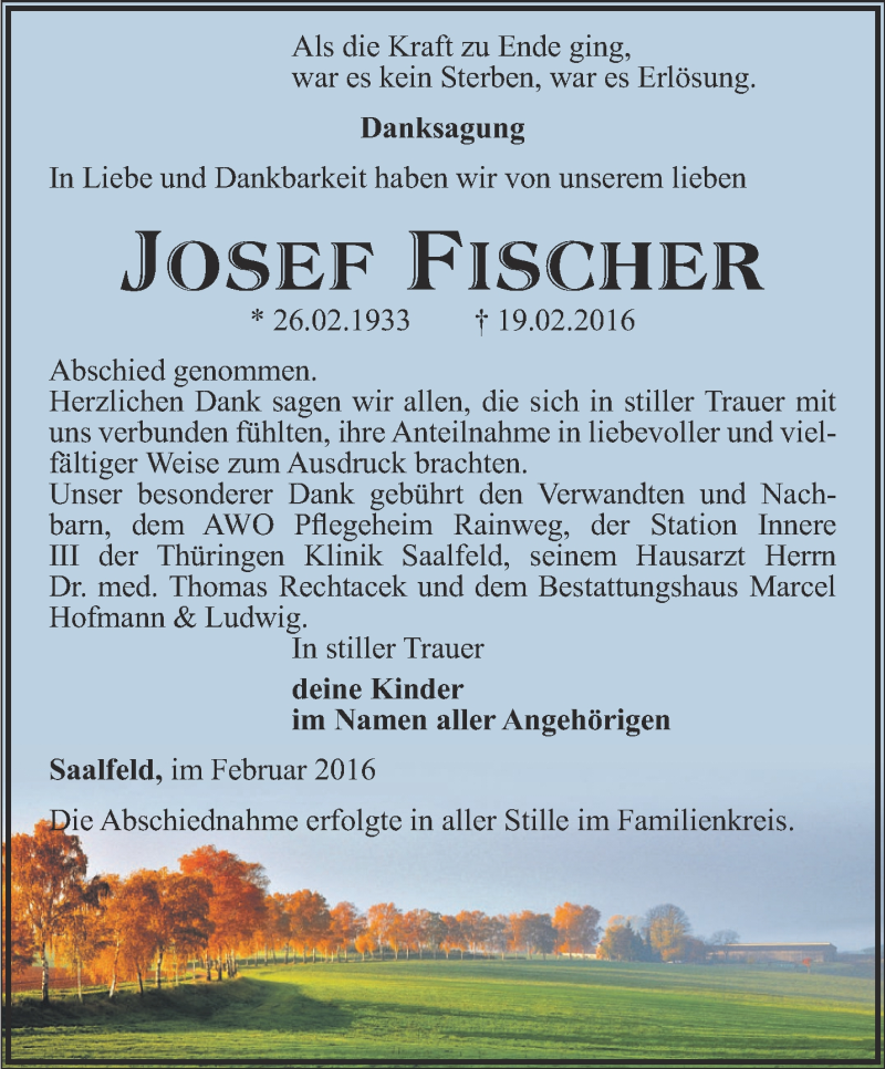 Hier finden Sie alle Traueranzeigen aus der Zeitung, die bisher für Josef Fischer erschienen sind. Weitere Traueranzeigen, die in der Zeitung erscheinen, werden hier ebenfalls aufgelistet