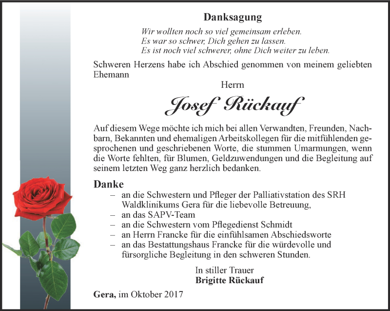 Hier finden Sie alle Traueranzeigen aus der Zeitung, die bisher für Josef Rückauf erschienen sind. Weitere Traueranzeigen, die in der Zeitung erscheinen, werden hier ebenfalls aufgelistet